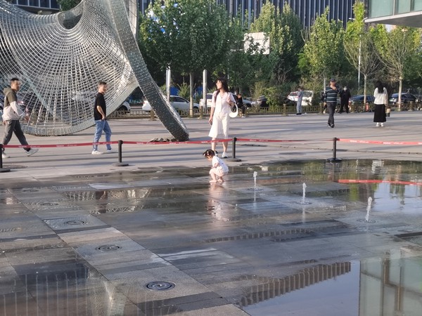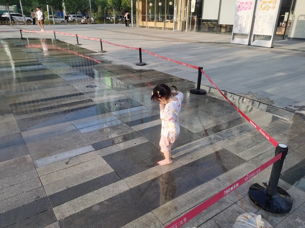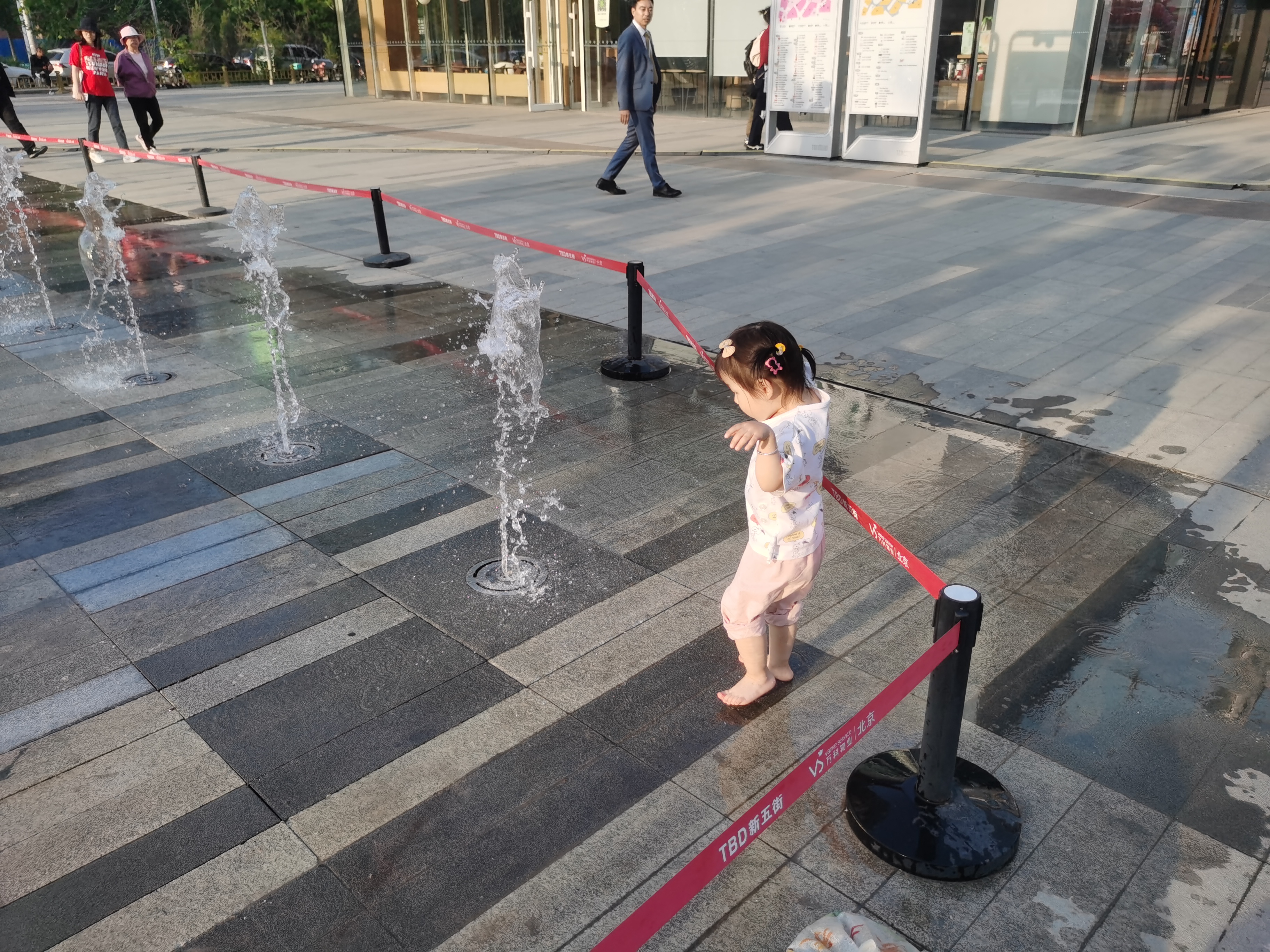 下午带着去朱辛庄玩,完了一会儿滑梯,看到有喷泉,玩了一会水。后面干脆鞋子脱了,在水里跳着玩,最后裤子都湿了,脱掉裤子,去麦当劳吃了饭就回家了。